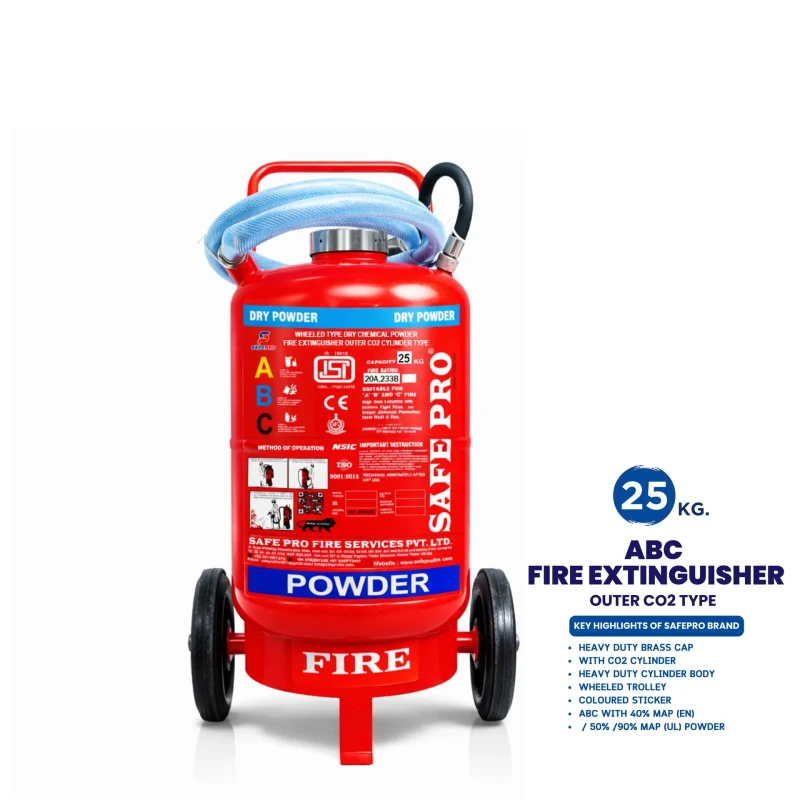 25 KG Fire Hunt ABC Type of Fire Extinguisher are suitable for office, hotels, hospitals,public places library etc.The Fire Extinguisher contains certified chemicals. The Monoammonium Phosphate Dry Powder Chemical plays key role on controlling the fire. The commercial grade Nitrogen Gas plays the role of propellent gas which helps the Powder to come out of the nozzle when you press the squeeze lever of the extinguisher. The extinguisher is equipped with the Manometer(Pressure Guage) which ensures the readyness of the extinguisher to use.